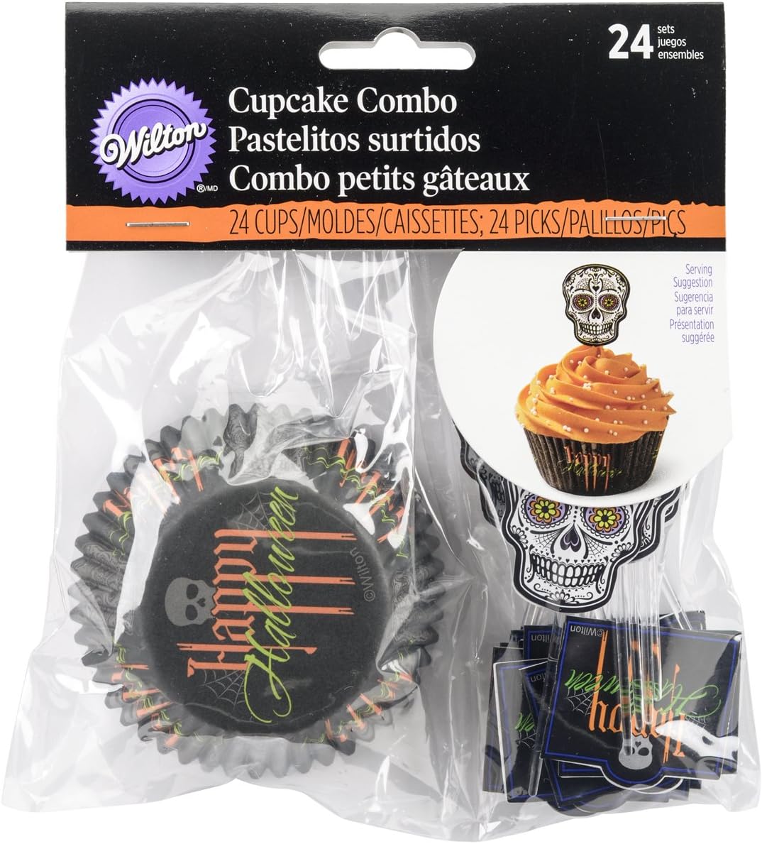 Organisez une fête d’Halloween pour adulte avec un bon goût classique. Servez des friandises dans un moule de pâtisserie mortel avec un jour de mort mort. Offrez à vos invités une présentation pour les adultes en utilisant ces moules de cuisson noirs sophistiqués et effrayants imprimés avec un message « Happy Halloween » orange fluo et vert et des motifs du jour des crânes morts sur les côtés. Le lot comprend 24 moules de cuisson standard et 24 décorations de gâteau amusantes. Comprend 12 têtes de mort et 12 décorations « Happy Halloween ».