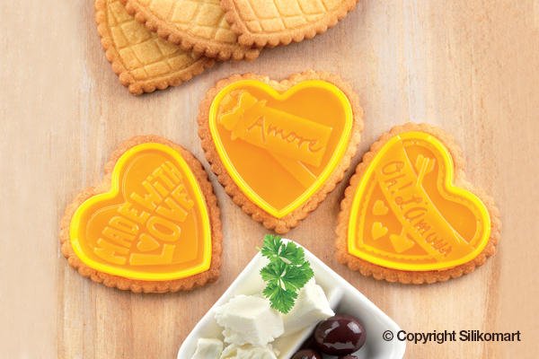 Avec le kit Cookie Love vous pouvez célébrer l’amour avec de tendres biscuits en forme de coeur, idéals pour la Saint Valentin et pour les occasions les plus romantique! Le kit se compose d’un emporte-pièce -doté d’une manche interchangeable et ergonomique avec une poignée silicone -et par un moule en silicone alimentaire 100% Made in Italy, résistant à temperatureche allant de -60 ° C à +230 ° C. Dimensions: 73 x 72 h 5 mm Volume: tot. 17 ml