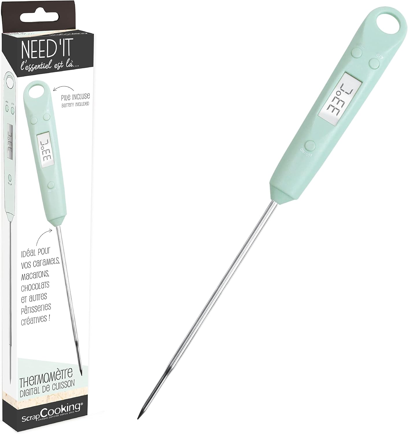 Thermomètre alimentaire digital pour réaliser des caramels, macarons, tempérer le chocolat… Pile incluse.